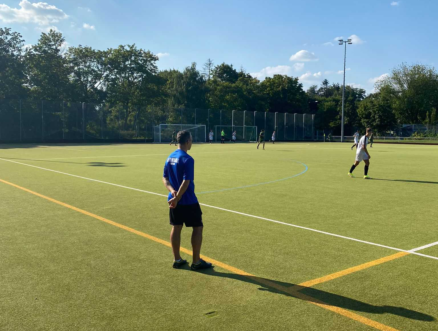 Die Enkheimer Physiotherapie-Praxis Volker Stiege stattet unsere E4 mit einem neuen Trikotsatz und Spielerjacken aus. Volker, selbst über mehrere Jahre in verschiedenen Funktionen bei der Germania aktiv, übergab die Sachen am letzten Samstag anlässlich des Heimspiels gegen den FFC Olympia an unsere 2016er Jungs. - Vielen Dank für diese großzügige Spende! Das Team belohnte sich anschließend mit den ersten drei Punkten der Hauptsaison und zeigte dabei eine sehr gute Teamleistung. Die Gäste vom FFC Olympia waren dabei keineswegs chancenlos, fanden jedoch spätestens bei Henry im Tor ihren Meister. In der Linie davor verteidigten Samu, Neil und später Flip sehr überzeugend und eröffneten immer wieder gute Spielzüge nach vorn. Zu Beginn der Partie fehlte noch etwas der Anschluss, mit Fortschreiten der Spielzeit kamen der heutige Kapitän Grischa über rechts, Amir zentral und Joshi links besser zur Geltung. Auch Marlon in der Spitze musste ein paar Defensivmeter mehr investieren, um Bindung zu bekommen. Als das nachjustiert war, bekamen wir unsere ersten Torgelegenheiten, die wir zunächst noch etwas überhastet - Stichwort: erster Kontakt - ungenutzt ließen. Das 1:0 brauchte somit bis kurz vor der Halbzeitpause, fasst dann unsere Verbesserung in einer schönen Kombination zusammen: Grischa erarbeitet sich den Ball halbrechts nahe des gegnerischen Strafraums und steckt durch auf Amir. Dieser täuscht den Abschluss an, passt dann aber links in den Strafraum zu Joshi, der seinen Gegenspieler mit einer Täuschung auswackelte. Sein anschließender Querpass findet am zweiten Pfosten Marlon, der im ersten Kontakt (!) aus kurzer Distanz einnetzte. Zum zweiten Durchgang kamen Flip und mit seinem Punktspiel-Debüt Devin in die Partie. Und letztgenannter war auch gleich am zweiten Tor beteiligt: Samu hatte rechts defensiv den Ball, spielte ihn eigentlich unbedrängt einem Gegner in den Fuß, setzte diesen aber sofort unter Druck und eroberte das Spielgerät wieder. Eigentlich taktisch unklug ging er weiter ins Dribbling - ein Ballverlust hätte uns defensiv offen stehen lassen. Doch er behielt den Ball und fand dann irgendwann Amir in zentraler Position. Unsere wuselige Schaltzentrale leitete auf Devin weiter, der bei seinem Entgegenkommen jedoch ins Straucheln geriet. Das irritierte auch seinen Gegenspieler und der Ball rutschte zu Joshi halblinks durch. Er drang in den Strafraum ein, nahm sich ein Herz und verwandelte sicher ins rechte kleine Netz. Das 2:0 beruhigte die Partie etwas und beide Trainer wollten in der Folge mit Wechseln neue Impulse setzen. Der Druck auf unsere Abwehr stieg, Olympia gab sich noch nicht geschlagen. Und auch wir hatten noch Durst auf einen weiteren Treffer. So wogte die Partie hin und her mit Chancen auf beiden Seiten, jedoch bis zur 42. Minute ohne zählbarem Erfolg. Dann bekam Amir kurz vor dem Strafraum die Kugel, drang in ihn ein und schloss aus mittiger Position ins rechte obere Toreck ab. Der Olypmpia-Keeper streckte sich und kam noch dran, konnte den Einschlag ins Netz aber nicht verhindern. Die Gäste wollten auch danach noch nicht aufstecken, der Druck auf unsere Defensive war enorm. Das lag auch an unseren Spielzügen, denn wir konnten die Qualität von davor nicht halten und gaben die Kugel zu überhastet weg. So mussten wir ein ums andere Mal im Vollsprint zurückeilen. Die normale Spielzeit war bereits abgelaufen, als Olympia abermals auf dem Weg zu unserem Tor war. Flip war wieder megastark zurückgeeilt und klärte zur Ecke. Doch der Pfiff des Unparteiischen bedeutete nichts Gutes - er sah ein Foul und gab dementsprechend Strafstoß. Diese Chance ließ sich Olympia nicht nehmen und verkürzte auf 3:1. Kurz darauf ertönte erneut ein Pfiff: Es war der Schlusspfiff und die 3 Punkte waren unter Dach und Fach - unter dem Strich leistungsgerecht. Unsere neue E4 ist somit spätestens seit Samstag mit 4 Punkten aus 3 Spielen gut in ihrer Liga angekommen und nun auch bestens ausgestattet.