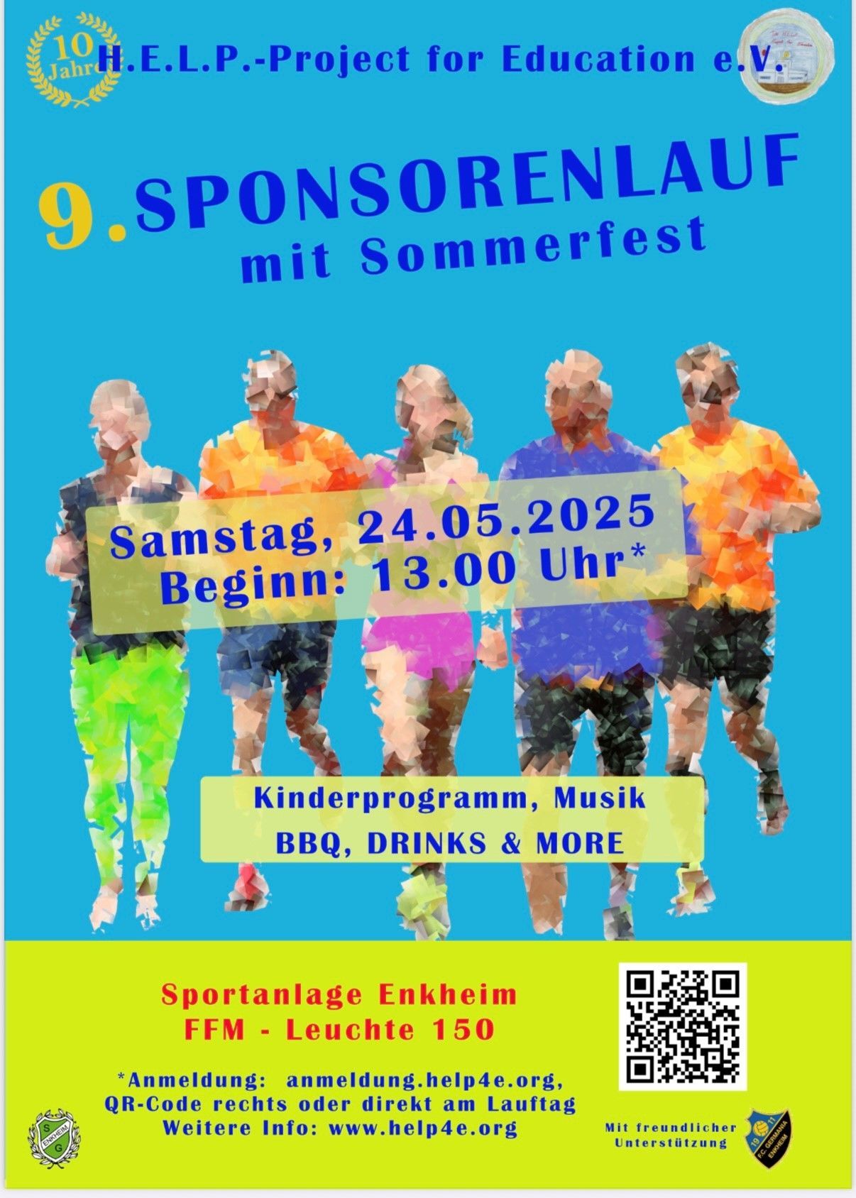 Der 9. Sponsorenlauf findet am Samstag, den 24. Mai, ab 13:00 Uhr auf dem Sportplatz in Enkheim statt! So funktioniert’s: Jeder Läufer sucht sich einen Sponsor, der bereit ist, pro gelaufener Runde einen bestimmten Betrag zu spenden – zum Beispiel 5 Euro pro Runde. Je mehr Runden absolviert werden, desto höher ist der Betrag, der unseren Projekten zugutekommt! Es gibt folgende Läufe: • Erwachsenenlauf (1 Stunde) • Kinderlauf (30 Minuten) • Teamlauf (1 Runde) – mit Gruppen wie Feuerwehr, Fußballer, Sekttrinker, Fußballtrainer usw. Abschluss-Highlight: Ab 16:30 Uhr: Das traditionelle Fußballspiel AH Seckbach vs. Donnerstagskicker Enkheim Für Stimmung ist gesorgt: Musik, Hüpfburg, Kaffee & Kuchen, Essen & Getränke – und natürlich jede Menge Spaß! Kommt vorbei und unterstützt unsere Projekte! Zur Anmeldung: https://forms.office.com/r/F7THZD58ma Der H.E.L.P. Project for Education e.V. ist ein gemeinnütziger Verein mit Sitz in Frankfurt. Er unterstützt Bildungsprojekte weltweit und wurde am 11.12.2012 gegründet. Weitere Informationen: www.help4e.org info@help4e.org