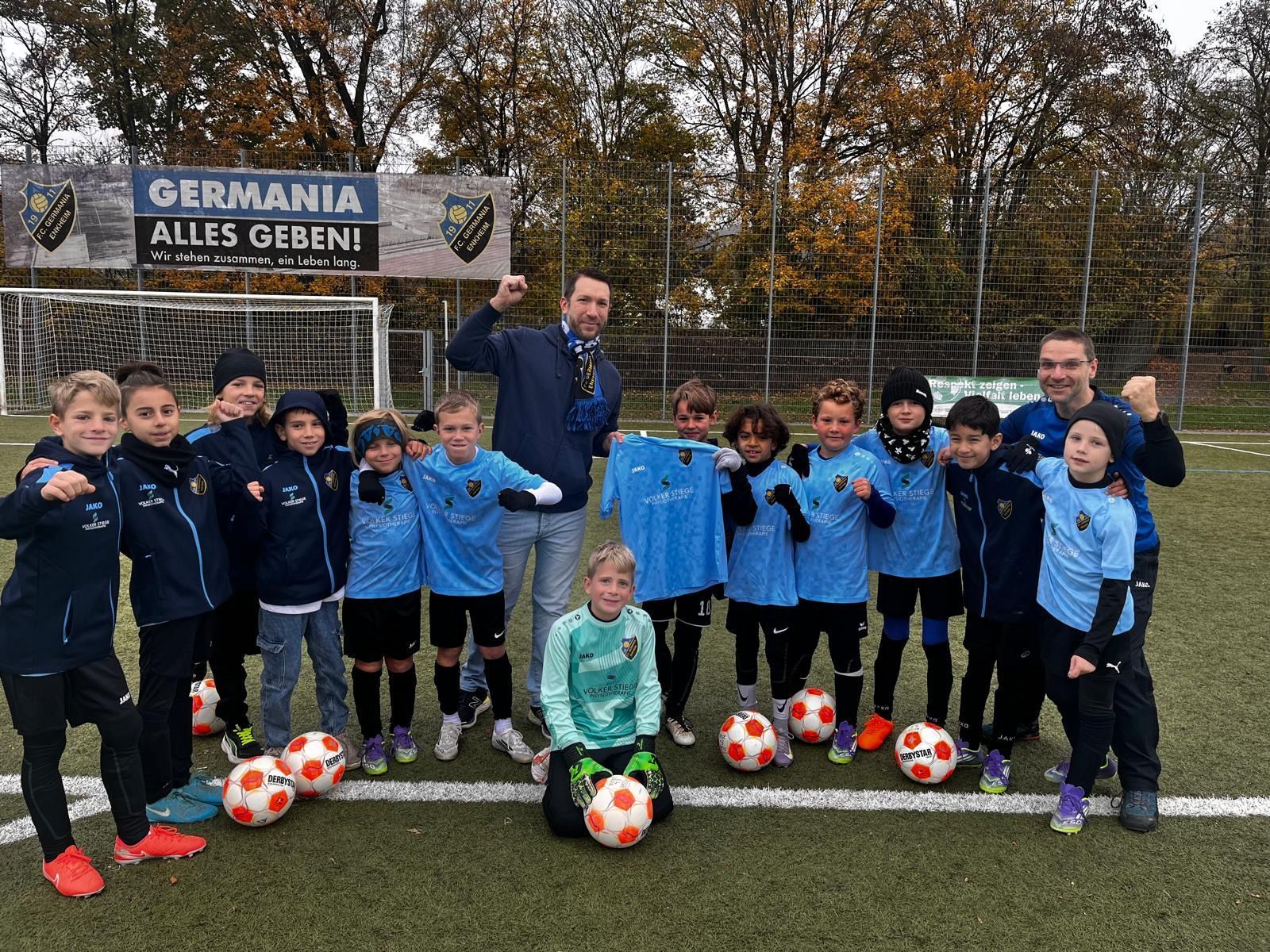 Die Enkheimer Physiotherapie-Praxis Volker Stiege stattet unsere E4 mit einem neuen Trikotsatz und Spielerjacken aus. Volker, selbst über mehrere Jahre in verschiedenen Funktionen bei der Germania aktiv, übergab die Sachen am letzten Samstag anlässlich des Heimspiels gegen den FFC Olympia an unsere 2016er Jungs. - Vielen Dank für diese großzügige Spende! Das Team belohnte sich anschließend mit den ersten drei Punkten der Hauptsaison und zeigte dabei eine sehr gute Teamleistung. Die Gäste vom FFC Olympia waren dabei keineswegs chancenlos, fanden jedoch spätestens bei Henry im Tor ihren Meister. In der Linie davor verteidigten Samu, Neil und später Flip sehr überzeugend und eröffneten immer wieder gute Spielzüge nach vorn. Zu Beginn der Partie fehlte noch etwas der Anschluss, mit Fortschreiten der Spielzeit kamen der heutige Kapitän Grischa über rechts, Amir zentral und Joshi links besser zur Geltung. Auch Marlon in der Spitze musste ein paar Defensivmeter mehr investieren, um Bindung zu bekommen. Als das nachjustiert war, bekamen wir unsere ersten Torgelegenheiten, die wir zunächst noch etwas überhastet - Stichwort: erster Kontakt - ungenutzt ließen. Das 1:0 brauchte somit bis kurz vor der Halbzeitpause, fasst dann unsere Verbesserung in einer schönen Kombination zusammen: Grischa erarbeitet sich den Ball halbrechts nahe des gegnerischen Strafraums und steckt durch auf Amir. Dieser täuscht den Abschluss an, passt dann aber links in den Strafraum zu Joshi, der seinen Gegenspieler mit einer Täuschung auswackelte. Sein anschließender Querpass findet am zweiten Pfosten Marlon, der im ersten Kontakt (!) aus kurzer Distanz einnetzte. Zum zweiten Durchgang kamen Flip und mit seinem Punktspiel-Debüt Devin in die Partie. Und letztgenannter war auch gleich am zweiten Tor beteiligt: Samu hatte rechts defensiv den Ball, spielte ihn eigentlich unbedrängt einem Gegner in den Fuß, setzte diesen aber sofort unter Druck und eroberte das Spielgerät wieder. Eigentlich taktisch unklug ging er weiter ins Dribbling - ein Ballverlust hätte uns defensiv offen stehen lassen. Doch er behielt den Ball und fand dann irgendwann Amir in zentraler Position. Unsere wuselige Schaltzentrale leitete auf Devin weiter, der bei seinem Entgegenkommen jedoch ins Straucheln geriet. Das irritierte auch seinen Gegenspieler und der Ball rutschte zu Joshi halblinks durch. Er drang in den Strafraum ein, nahm sich ein Herz und verwandelte sicher ins rechte kleine Netz. Das 2:0 beruhigte die Partie etwas und beide Trainer wollten in der Folge mit Wechseln neue Impulse setzen. Der Druck auf unsere Abwehr stieg, Olympia gab sich noch nicht geschlagen. Und auch wir hatten noch Durst auf einen weiteren Treffer. So wogte die Partie hin und her mit Chancen auf beiden Seiten, jedoch bis zur 42. Minute ohne zählbarem Erfolg. Dann bekam Amir kurz vor dem Strafraum die Kugel, drang in ihn ein und schloss aus mittiger Position ins rechte obere Toreck ab. Der Olypmpia-Keeper streckte sich und kam noch dran, konnte den Einschlag ins Netz aber nicht verhindern. Die Gäste wollten auch danach noch nicht aufstecken, der Druck auf unsere Defensive war enorm. Das lag auch an unseren Spielzügen, denn wir konnten die Qualität von davor nicht halten und gaben die Kugel zu überhastet weg. So mussten wir ein ums andere Mal im Vollsprint zurückeilen. Die normale Spielzeit war bereits abgelaufen, als Olympia abermals auf dem Weg zu unserem Tor war. Flip war wieder megastark zurückgeeilt und klärte zur Ecke. Doch der Pfiff des Unparteiischen bedeutete nichts Gutes - er sah ein Foul und gab dementsprechend Strafstoß. Diese Chance ließ sich Olympia nicht nehmen und verkürzte auf 3:1. Kurz darauf ertönte erneut ein Pfiff: Es war der Schlusspfiff und die 3 Punkte waren unter Dach und Fach - unter dem Strich leistungsgerecht. Unsere neue E4 ist somit spätestens seit Samstag mit 4 Punkten aus 3 Spielen gut in ihrer Liga angekommen und nun auch bestens ausgestattet.