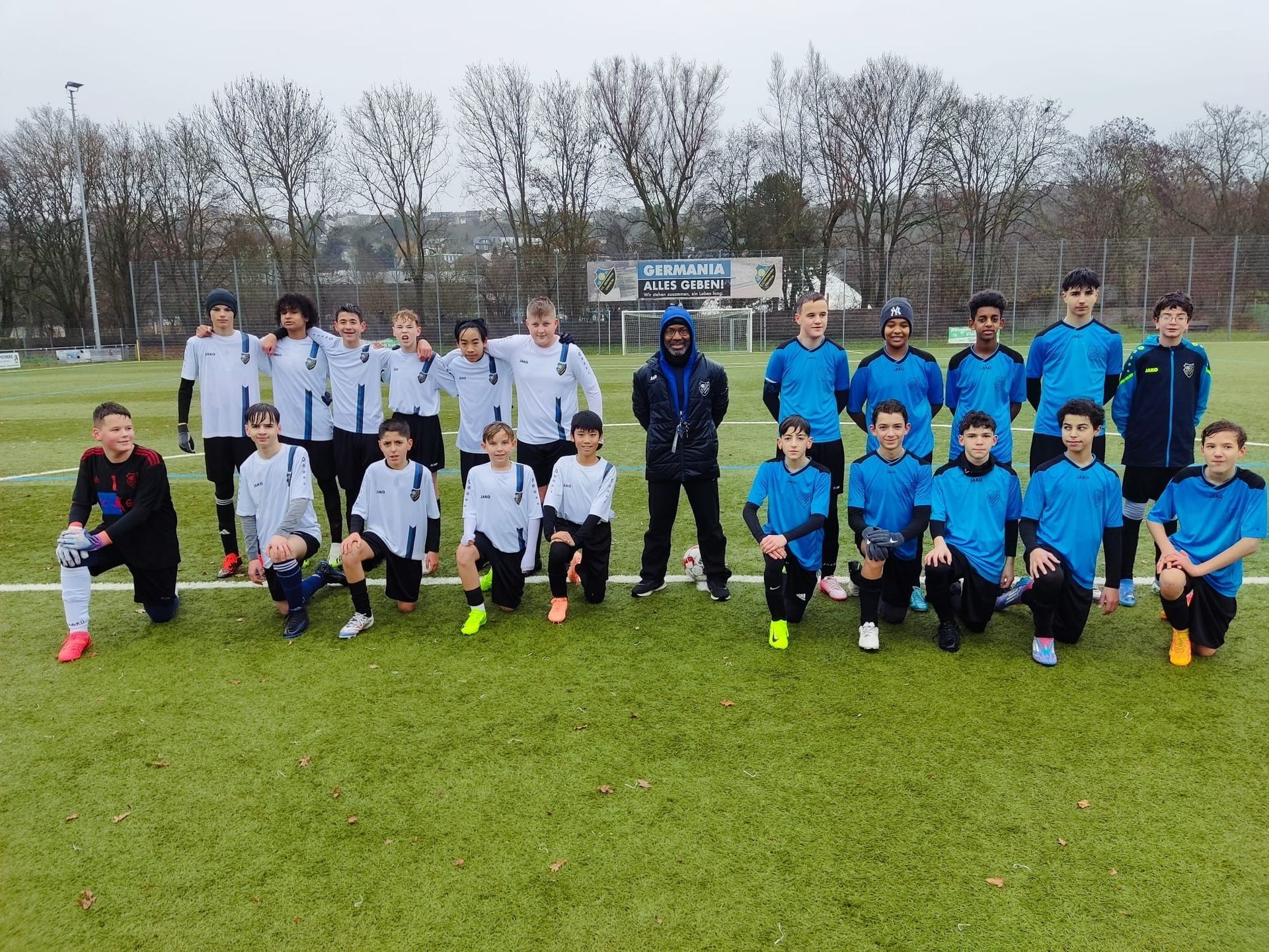 Wer dachte, das spielfreie Wochenende könne gemütlich mit Schlafen und Zocken verbracht werden, lag gründlich daneben. Stattdessen hieß es für die Spieler der C2 von Germania am Samstagmorgen: „Wir können nur uns selbst schlagen!“ Um 8:30 Uhr versammelten sich die Spieler in der Kabine, um sich auf ein besonderes internes Freundschaftsspiel vorzubereiten. Das Ziel war klar: Spielpraxis sammeln, das Spielsystem verinnerlichen und die Spieler gegenseitig fordern. Anpfiff bei strömendem Regen Nach einer kurzen Besprechung und der Einteilung in zwei spielerisch ausgeglichene Teams ging es um 9:30 Uhr bei strömendem Regen los. Team A trat in türkisfarbenen Trikots an, während Team B in Weiß spielte. Von Beginn an zeigte sich, dass beide Teams motiviert waren. Team A startete etwas besser in die Partie und konnte sich früh mit 1:0 in Führung bringen. Doch Team B kämpfte sich zurück ins Spiel und nutzte kurz vor der Halbzeitpause eine Unachtsamkeit in der Abwehr von Team A zum verdienten Ausgleich. Mit einem 1:1 ging es in die Pause – die jedoch kurz ausfiel, da die nächsten Mannschaften bereits auf den Platz warteten. Kurze aber intensive zweite Halbzeit Nach der Trinkpause ging es direkt weiter. Beide Teams zeigten viel Einsatz und setzten taktische Vorgaben der Trainer gut um. Trotz des anhaltenden Regens blieb das Spiel fair und spannend. Die Entscheidung fiel schließlich durch eine klug herausgespielte Aktion von Team A, die mit dem 2:1-Siegtreffer belohnt wurde. Gemeinsamer Erfolg trotz Sieger und Verlierer Mit dem Schlusspfiff stürmten die Spieler erleichtert in die Kabine, um sich mit einer heißen Tasse Tee aufzuwärmen. Diesmal war das Ergebnis nebensächlich – wichtig war die Erkenntnis, dass alle Spieler etwas gelernt hatten und gemeinsam weiter wachsen konnten. Das interne Duell hat eindrucksvoll gezeigt, dass die Germania C2 mit ihrem Einsatz und Teamgeist bestens auf die kommenden Herausforderungen vorbereitet ist. Team A-Türkis 1. Afiff 2. Vlad 3. Luka 4. Novel 5. Metehan 6. Noah 7. Amar 8. Saman 9. Jamil 10. Akram 11. Devran 12. Miro 13. Matvii Team B-Weiß 1. Kenan 2. Anel 3. Davud 4. Thanh Phuong 5. Orges 6. Avdovic 7. Yusuf 8. Ilias 9. Rafa 10. Ole 11. Yuelin 12. Adonei